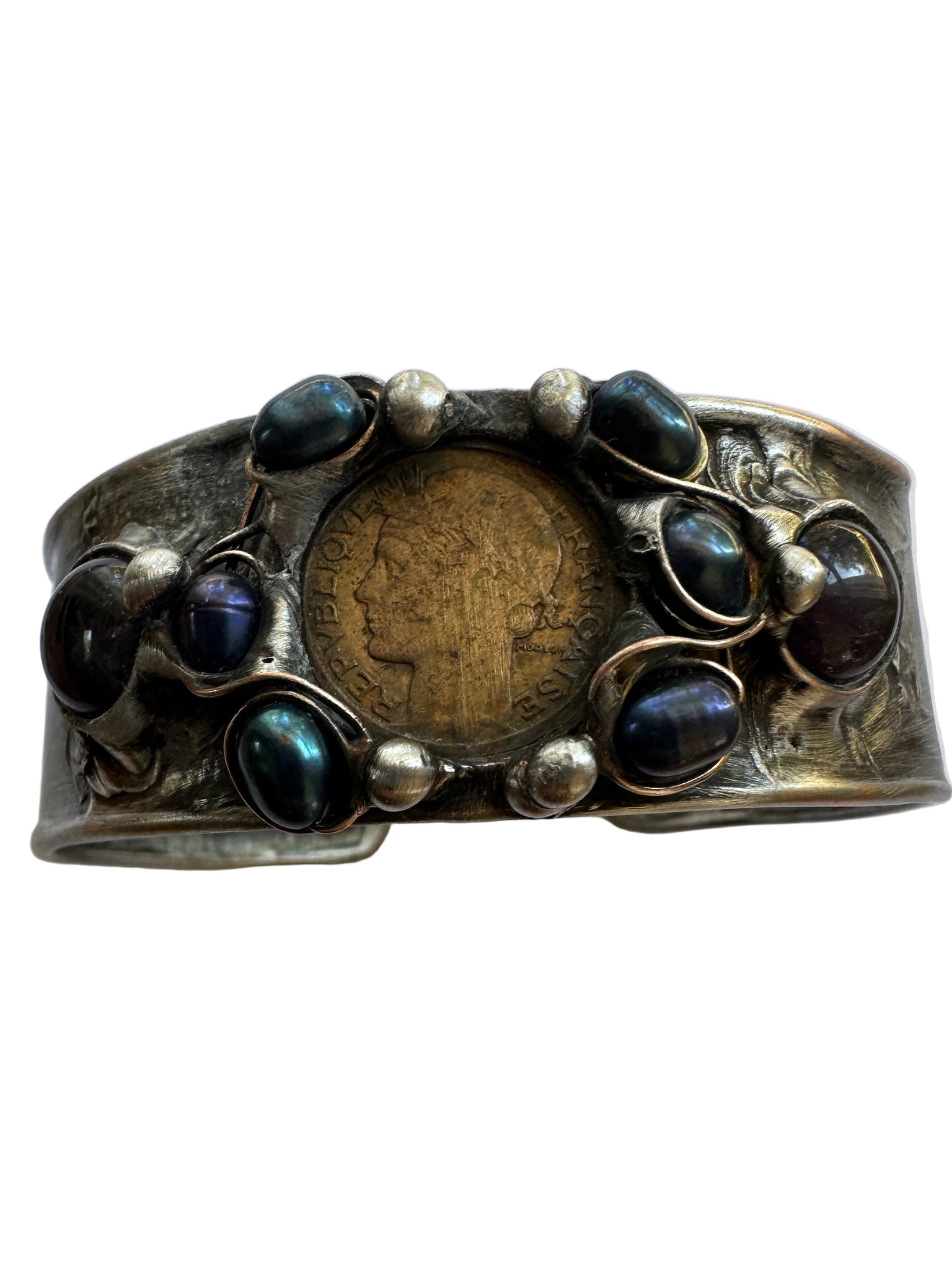 Vintage bronze French coin from the 1930’s. Set on flexible metal cuff that fits various wrist sizes. Only one available.