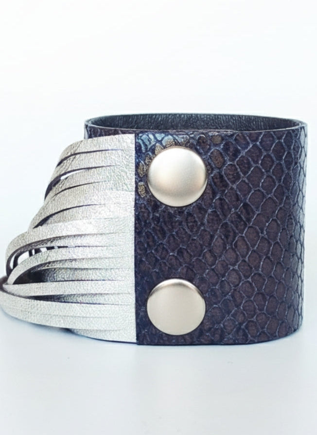Italian leather in super soft python.  Metallic silver fringe with a rich chocolate suede on the reverse. Adjustable snap closure.